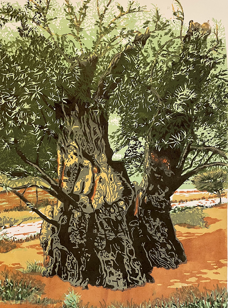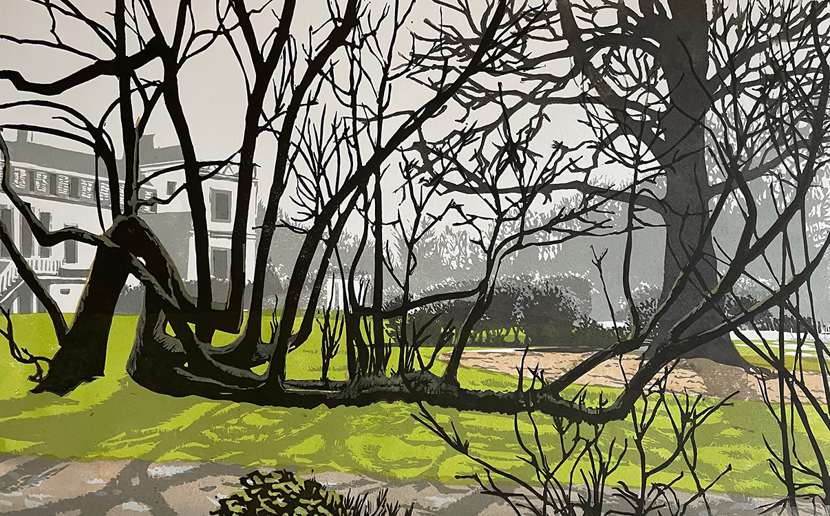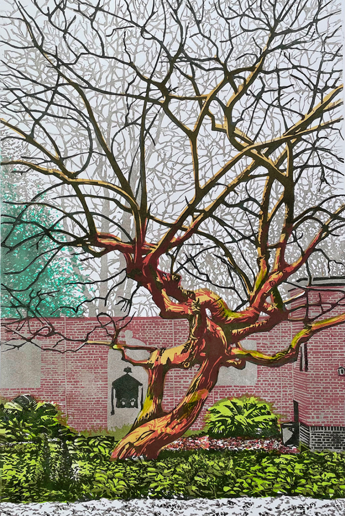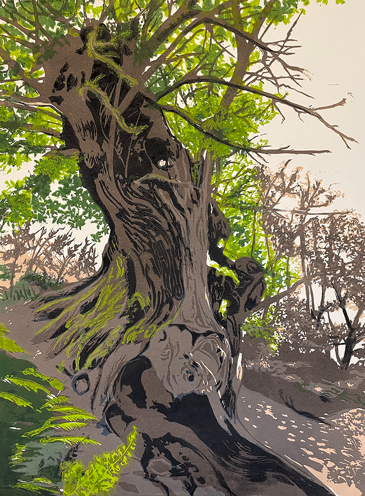 Na mijn pensionering heb ik mijn aandacht enigszins verlegd naar het maken van video-films, vaak met kunst als onderwerp, maar sinds 2023 heb ik het linosnijden weer opgestart en ben sindsdien fanatiek bezig met bomen als onderwerp. De bomen hebben iets bijzonders. Ze zijn aangetast en vervormd door ouderdom, snoei of het weer. Ze lijken gewikkeld in een strijd om het bestaan.